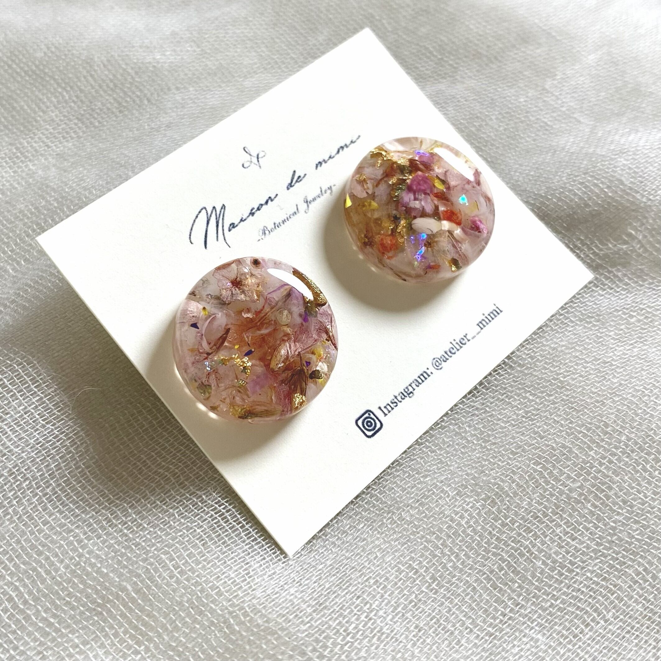 Maison de mimi の日常ライン Mimi quotidien より、透明なレジンの中に咲く花を閉じ込めたシンプルなピアス。