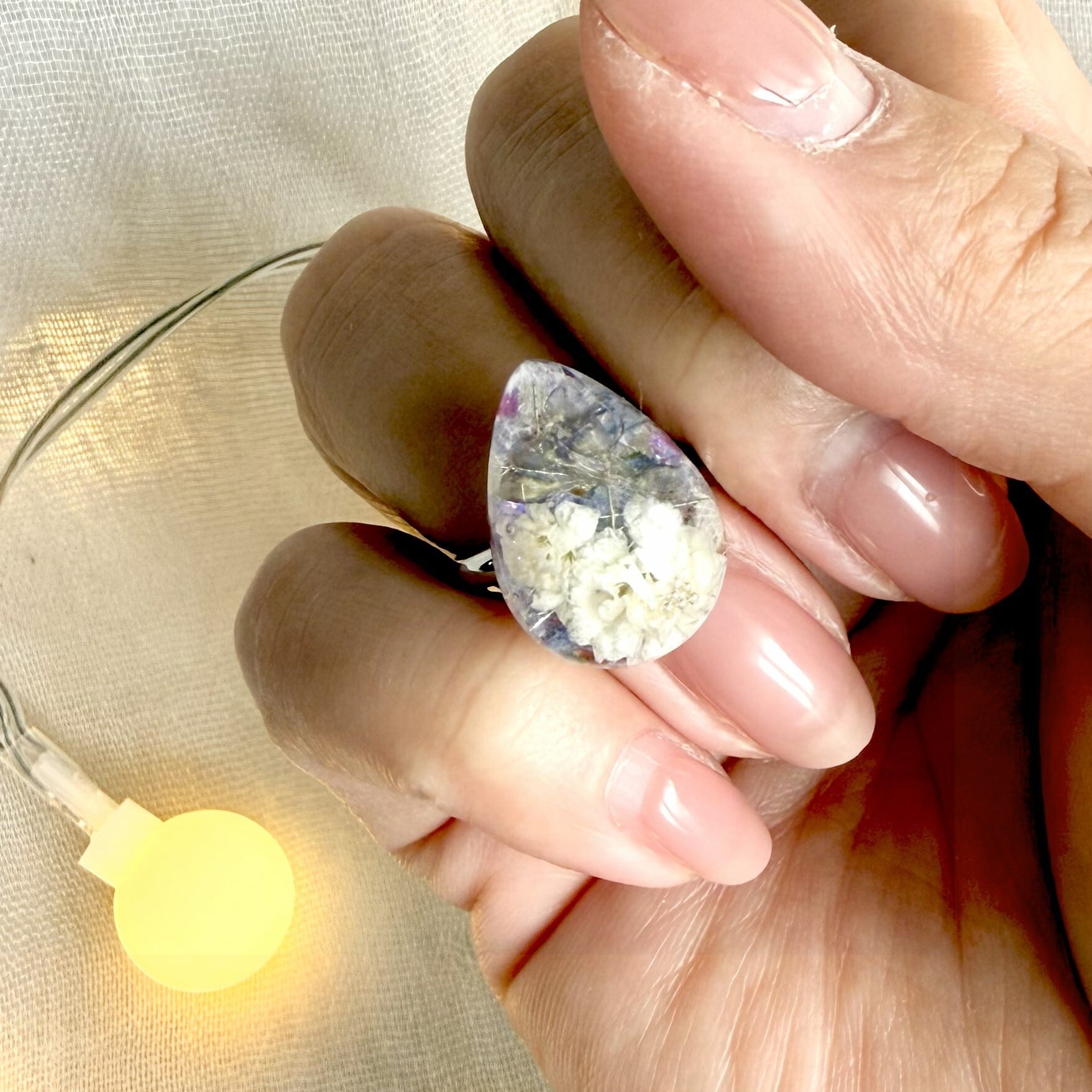 本物の花がゆっくりと浮かぶレジンは、光の角度で雰囲気が変わり、
